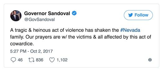 拉斯维加斯所在的内华达州的州长Brian Sandoval也发布推文说:“如此悲剧性的暴力事件彻底震撼了内华达的居民和家庭。让我们为受害者祈祷”