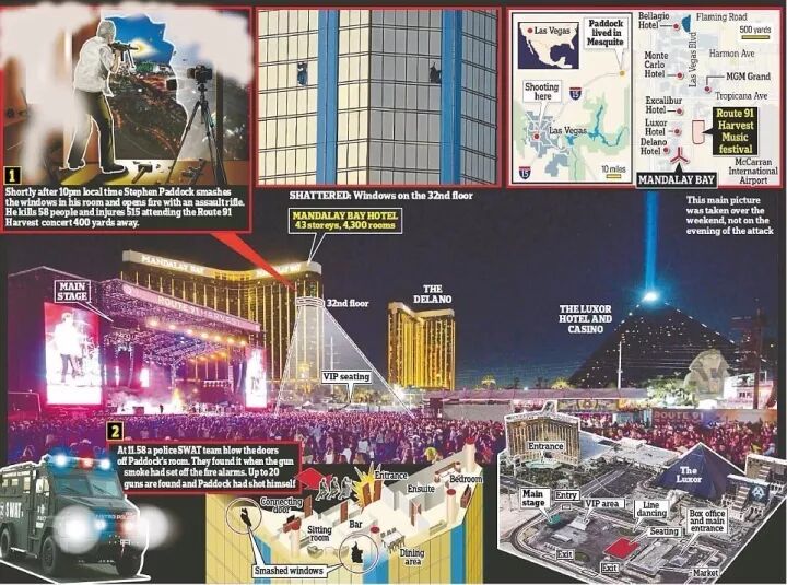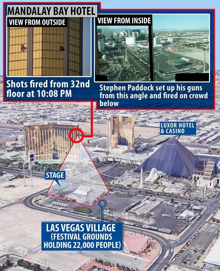 据BBC中文网报道,枪手从9月28日起就入住Mandalay Bay饭店32楼,10月1日晚从32层向楼下的露天音乐节场内的观众扫射。
