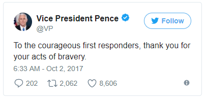 随后,副总统 Mike Pence也发推称,对在袭击中迅速做出反应的民众和警务人员给予了感谢,并慰问了受害者。