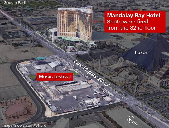 拉斯韦加斯所在的克拉克县治安官约瑟夫·隆巴尔多说,枪手名为斯蒂芬·帕多克,64岁,本地人,从与演唱会场地一街之隔的曼德勒海湾酒店32层开枪。一名目击者也告诉美联社记者,他看见这座酒店高层有闪光。